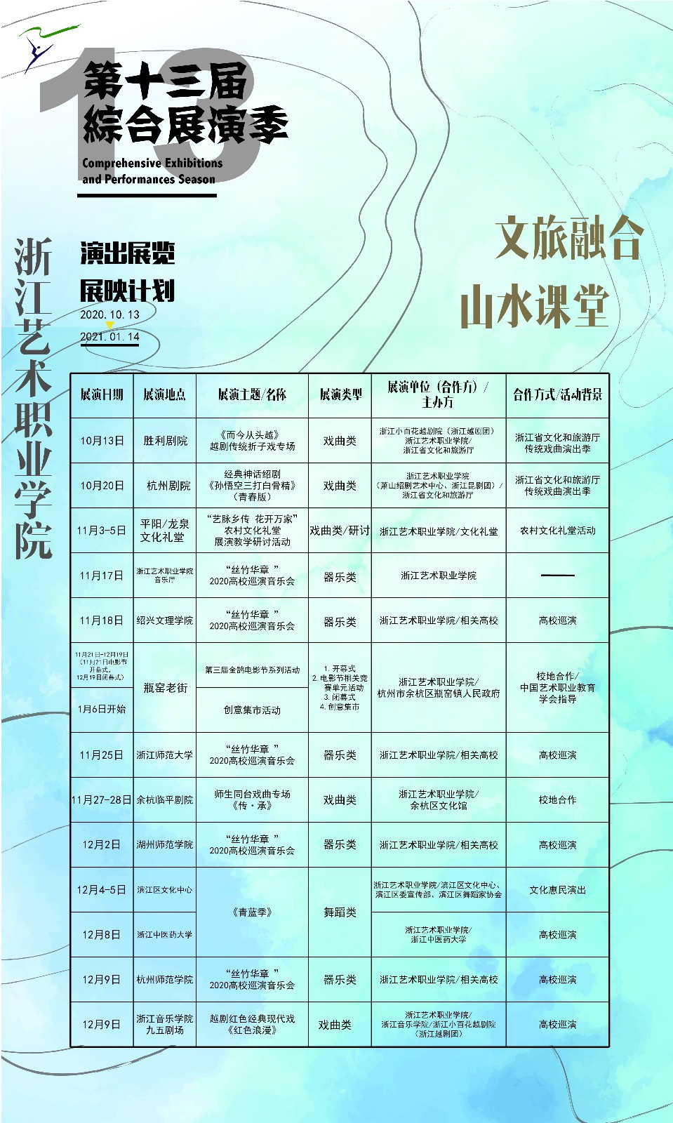 11月21日,以“青春之我,奋斗之我”为主题的第三届浙艺金鹄电影节暨原创影像大赛,将在杭州瓶窑古镇拉开帷幕,同时也意味着浙艺第13届综合展演季正式启动。在10月13日浙艺戏曲学院越剧折子戏专场《而今从头越》参加省文化和旅游厅“传统戏曲演出季”开始,我校综合展演季已进行了6项演出交流等活动,接下来2020浙艺民族室内乐团高校巡演音乐会、金鹄电影节、诗画浙江戏曲雅集《诗路行吟》、艺术装置陈列展览、手工艺优秀作品展览、话剧演出等将在杭州、湖州、绍兴、金华等地举行,花开浙江,艺展风华。
