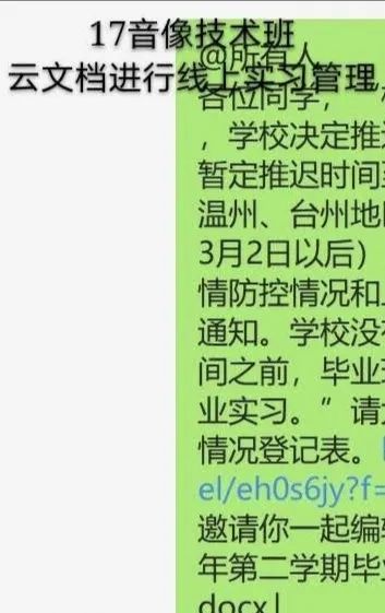 5个毕业班三管齐下防疫战疫、就业准备、论文答辩层层推进,17声像工程班采用微信短消息每日抄送每条信息落实到人,17音像技术班运用wps云文档协作功能及时更新班级学生实习就业最新信息,17影视多媒体班运用MIike CRM线上统计系统每日汇总学生情况,17摄影摄像班通过视频进行集体论文辅导,17影视编导班运用百度网盘进行学生健康码“云审核”制度,学生健康状况一键掌握。