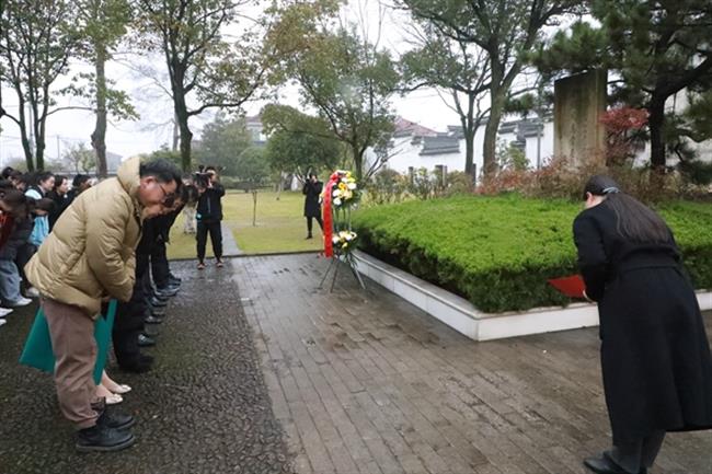 夏开堂与王毅在粟裕将军骨灰敬撒处敬献花篮,全体人员肃立、行礼。细雨蒙蒙,天地同感,现场全体人员在雨中齐唱《新四军军歌》,“千百次抗争,风雪饥寒;千万里转战,穷山野营。获得丰富的斗争经验,锻炼艰苦的牺牲精神……”不忘先辈苦辛,弘扬爱国精神。