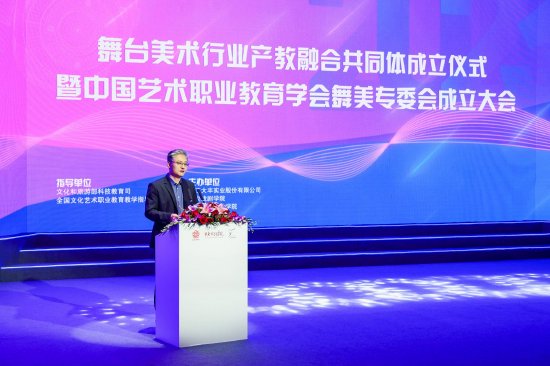 文化和旅游部科技教育司司长陶诚在致辞中指出,行业产教融合共同体是新时代我国现代职业教育体系“一体、两翼、五重点”改革的重要载体之一。成立舞台美术行业产教融合共同体是贯彻党的二十大精神、落实好“办好人民满意的教育”“繁荣发展文化事业和文化产业”要求的具体举措,要聚焦以下三个方面。一是统一目标。围绕打造“主体融合、要素聚集、资源共享、持久发展”舞美行业产业生态圈。二是加强联动。协调好科研院所、普通高校和职业学校开展有组织、成体系、成规模、成建制的人才培养、科学研究和社会服务。三是开放创新。秉持开放创新的精神,强化集体协作和联合攻关,积极为文化艺术职业教育服务行业产业发展积累新经验,提供新动能。