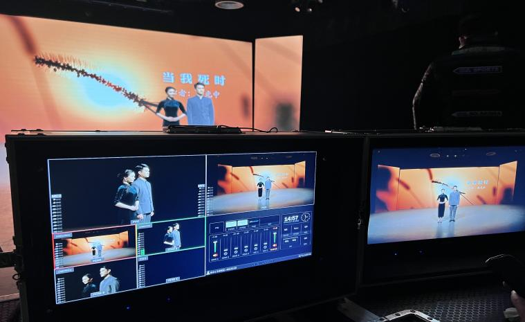我校进入总决赛线上比拼的团队由2020级戏剧影视表演专业学生屠熠昼、翁嘉怡组成。决赛当天,戏剧影视学院发挥综合优势,戏剧影视学院专任教师孙国虎团队前期反复调试保障了比赛当天摄录技术的稳定性,同时在设计学院专任教师叶文志和教学实践中心老师们的大力支持和通力配合下,参赛选手淋漓尽致地展现了赛前抽签作品余光中的《当我死时》,他们用声音绘画,用语言表达,声情并茂的朗诵得到评委会的一致认可,以总决赛平均分91.972分(职业院校学生组第一名)和提交视频作品综合成绩获得职业院校学生组一等奖。