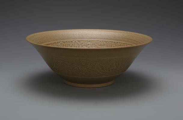 《草木灰釉刻划花斗笠碗》