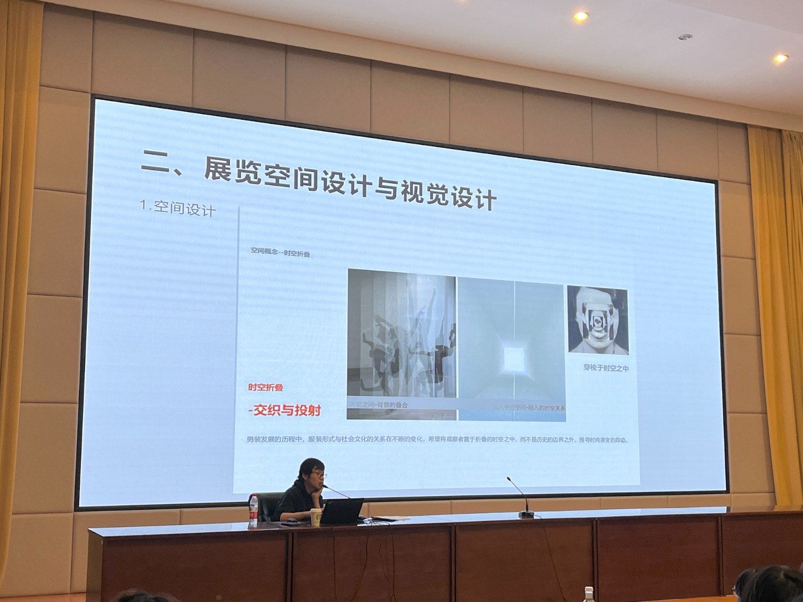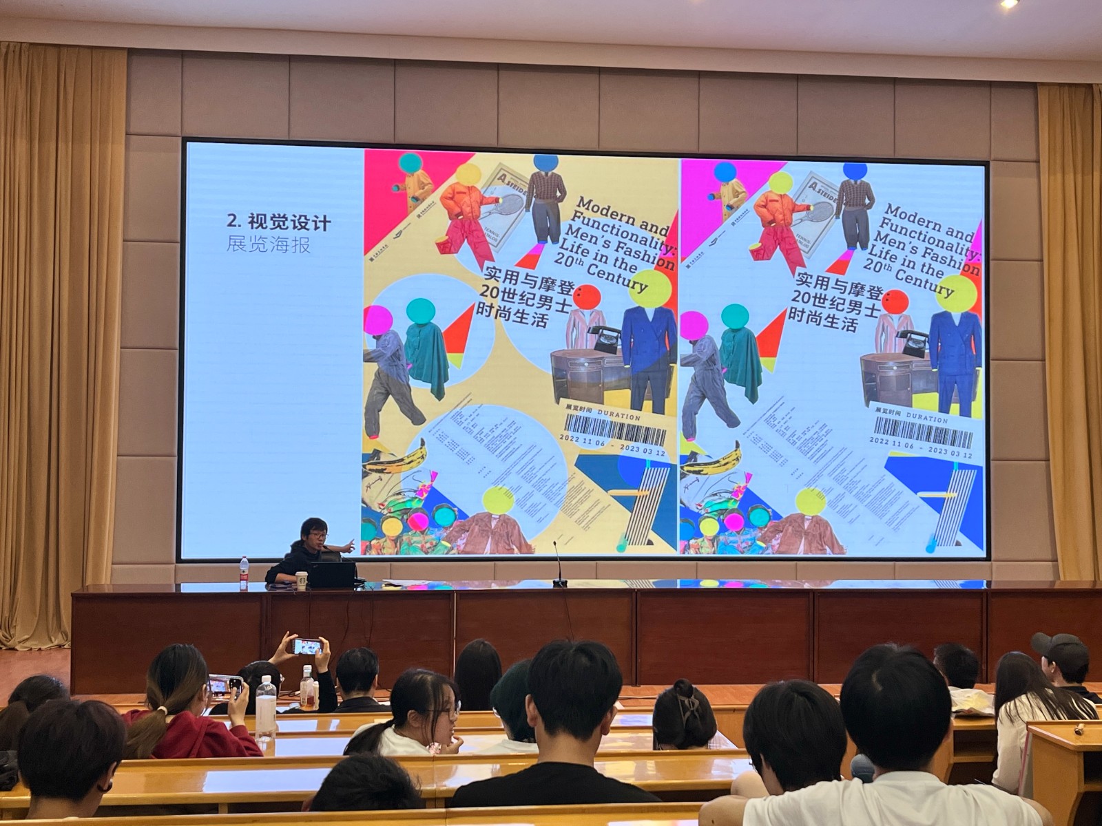 其次,高原讲述了展览的时空折叠,介绍了全息投影布等时装展览技术和空间设计,给学生们展示了此次男装展的平面视觉设计,展览的空间视觉设计色彩意向与逻辑,同时,对于展览现场和展陈作品也做了详尽的阐述。高原对男装展的各个板块进行介绍和概括,使展示专业的学生们了解二十世纪四十至九十年代西装的发展历程,讲述了爱德华时代、爵士时代的男装搭配特点,展示了大师手稿以及高原作为策展人对男装展的设计思路历程和方案。