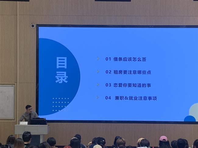 金文超律师以“大学生实用法律问题”为主题,以大学生身边鲜活生动的案件进一步引导同学们树立规则意识、法律意识,分别以“借条应该怎么写”“租房要注意哪些点”“恋爱你要知道的事”“兼职就业注意事项”四个方面以案说法,兼具学理性和故事性,给同学们清晰地界定“什么可以做、什么不能做”,明确自身行为界限,从而起到预防违法犯罪、减少矛盾纠纷的效果。