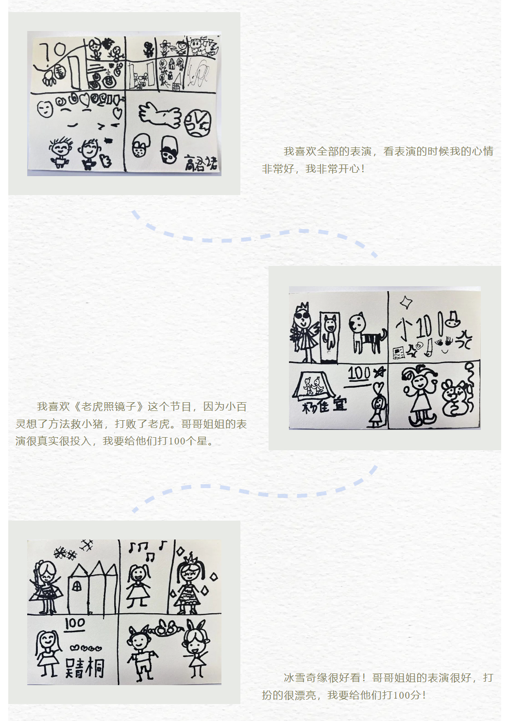 每场演出结束,小朋友们都会用自己的方式,在童言童语童画中表达着演出的难忘和对演员们的喜爱,这些童真的感受是对演出的最大肯定,也是对演员们辛勤付出的最好回报。