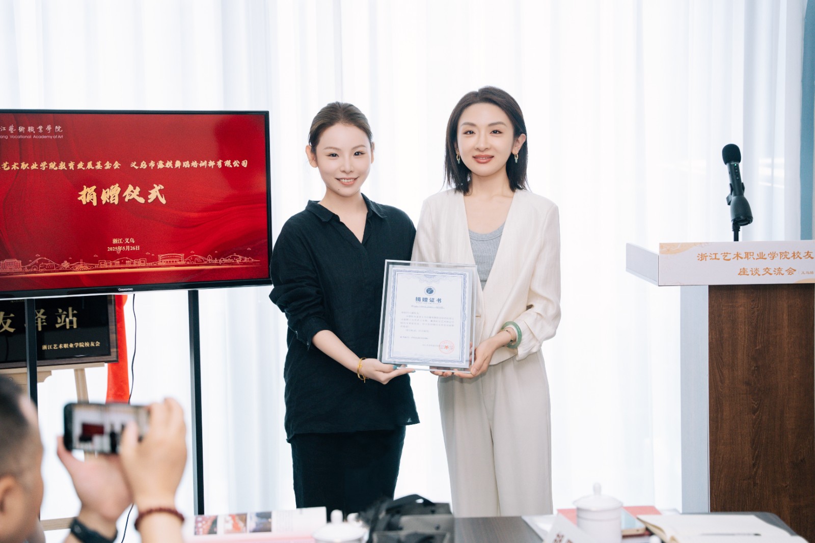 徐芳与义乌校友驿站负责人、2009级舞蹈表导专业校友王露共同为义乌校友驿站揭牌。